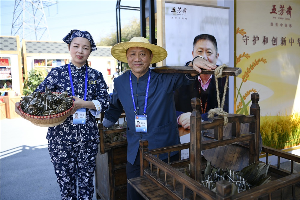 五芳齋作為長江經濟帶參展粽子企業代表向各地紛至沓來的國家領導、媒體及參訪團展示國家級非遺-五芳齋粽子制作技藝,講述了嘉興稻米文化歷史及米制品點心的傳承與創新。