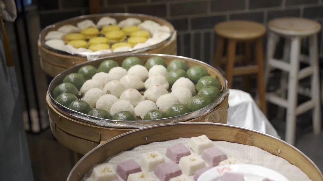 飲食文化也依時令隱含其中。民諺曰:“吃過夏至面,一天短一線。”夏至吃面是很多地區的習俗。因夏至新麥已經登場,所以夏至吃面也有嘗新的意思。除此之外,夏至吃糕團也寓意著節節高升以及平安健康。美食鑒賞家樊老師帶領徐老師品嘗了南門頭的特色美食——夏至面以及糕團。