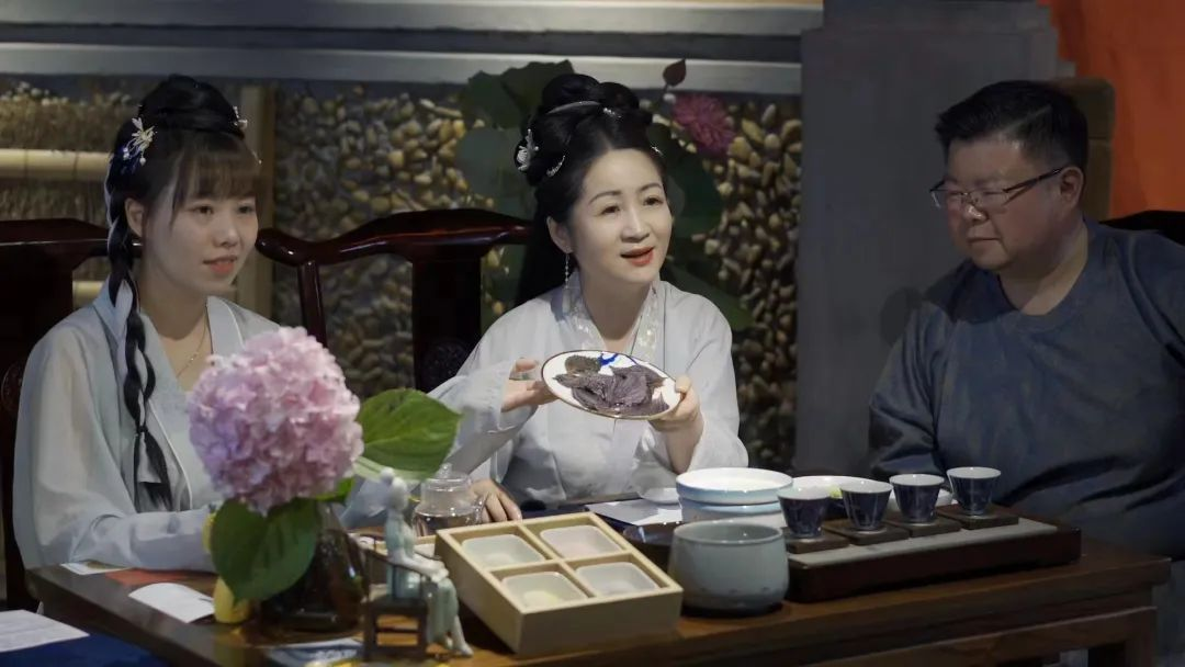 地域文化科普環節,嘉賓們嘗試了近期大熱《夢華錄》里的紫蘇飲以及宋代四雅之一“點茶”。明代高濂曾在《遵生八箋》中介紹過紫蘇飲的做法:“取葉,火上隔紙烘焙,不可翻動,修香收起。每用,以滾湯洗泡一次,傾去,將泡過紫蘇入壺,傾入滾水。服之,能寬胸導滯。”制備紫蘇熟飲需要將紫蘇葉用火炙逼出其香味,沖泡飲用與茶葉基本上類似。