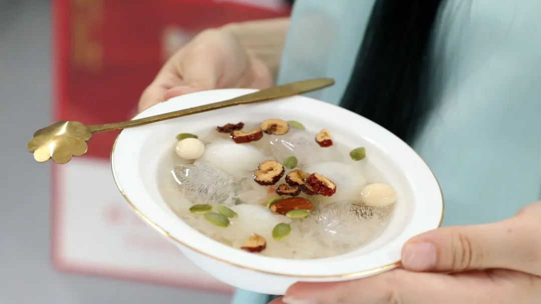 暑日心情容易煩躁,對此徐老師精心準(zhǔn)備古人同款的消暑秘方——五芳齋版 “冰雪冷元子”,煮熟的湯圓在冰水里浸泡過后,搭配冰鎮(zhèn)的五芳齋綠豆百合粥和燕窩銀耳羹,冰冰涼涼,甜甜糯糯,一秒解暑。